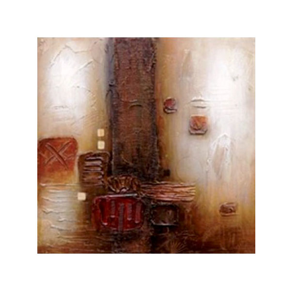 Subtle earth tones co-conspire with nonrepresentational blocks of color and textural design to create this modern abstract oil painting. A darkly hued vertical area creates the focal point where you eye is drawn into this dark and deep abyss. Modeled squares bridge the gap between light and darks, and add a feeling of randomness and unpredictability typical in true abstract art.