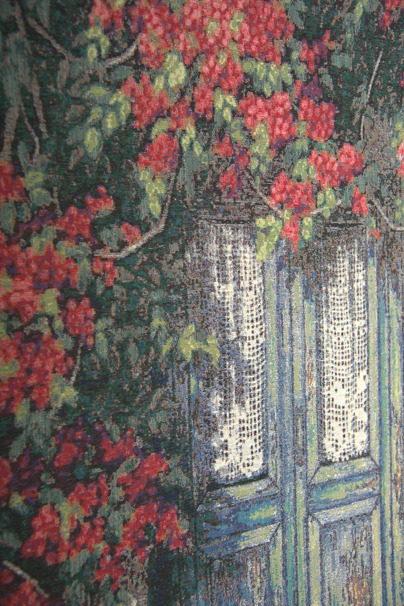 Bring a touch of mystery and botanical beauty to your home with our enchanting Cottage Door Tapestry. This emotive piece shows a weathered cottage door with vintage lace curtains framed by flowering vines with robust red blooms. On the doorstep sit a trio of potted plants with blooms bursting from each. Dappled sunlight gives a mystic aura to the scene. Where does the door lead? Who could be inside? This pretty floral wall hanging will bring intrigue to your kitchen or entry way. It ready to hang woven in cotton with a viscose/poly blend. Imported.