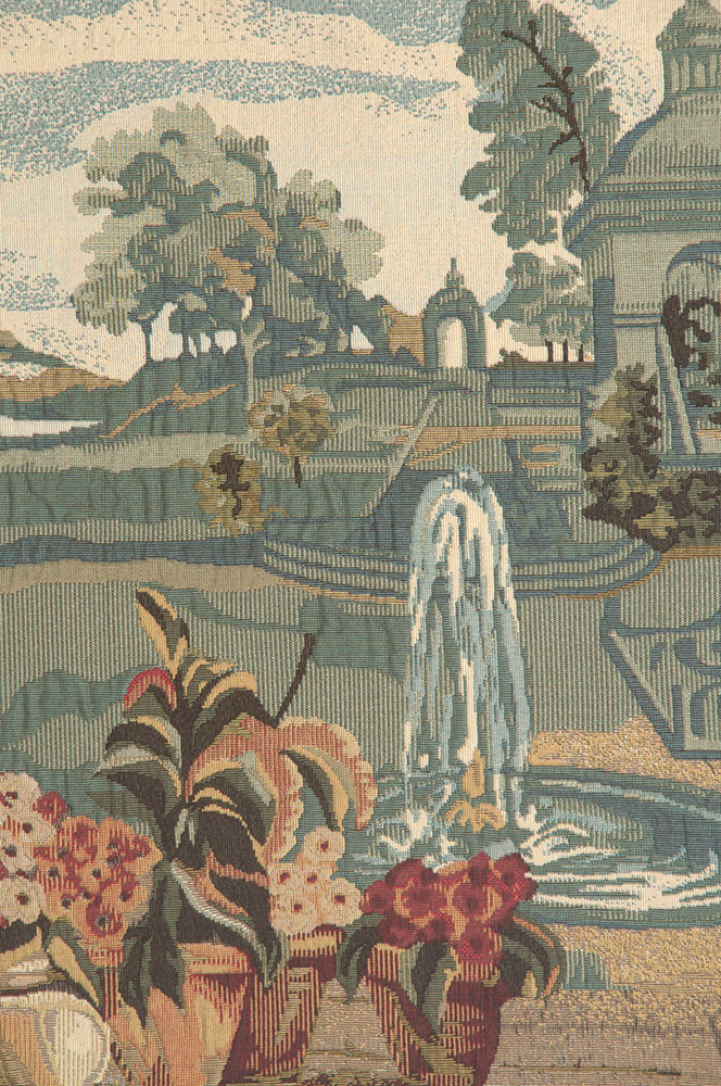 This tapestry is a detail of the right portion of the Triumph of Flora, one of a series of tapestries woven as a tribute to the gods. Flora is the Roman Goddess of gardens, spring, and fertility, and here stands one of her ladies who, large with child, stands as a symbol of fertility as she helps with the gardens that surround the temple.