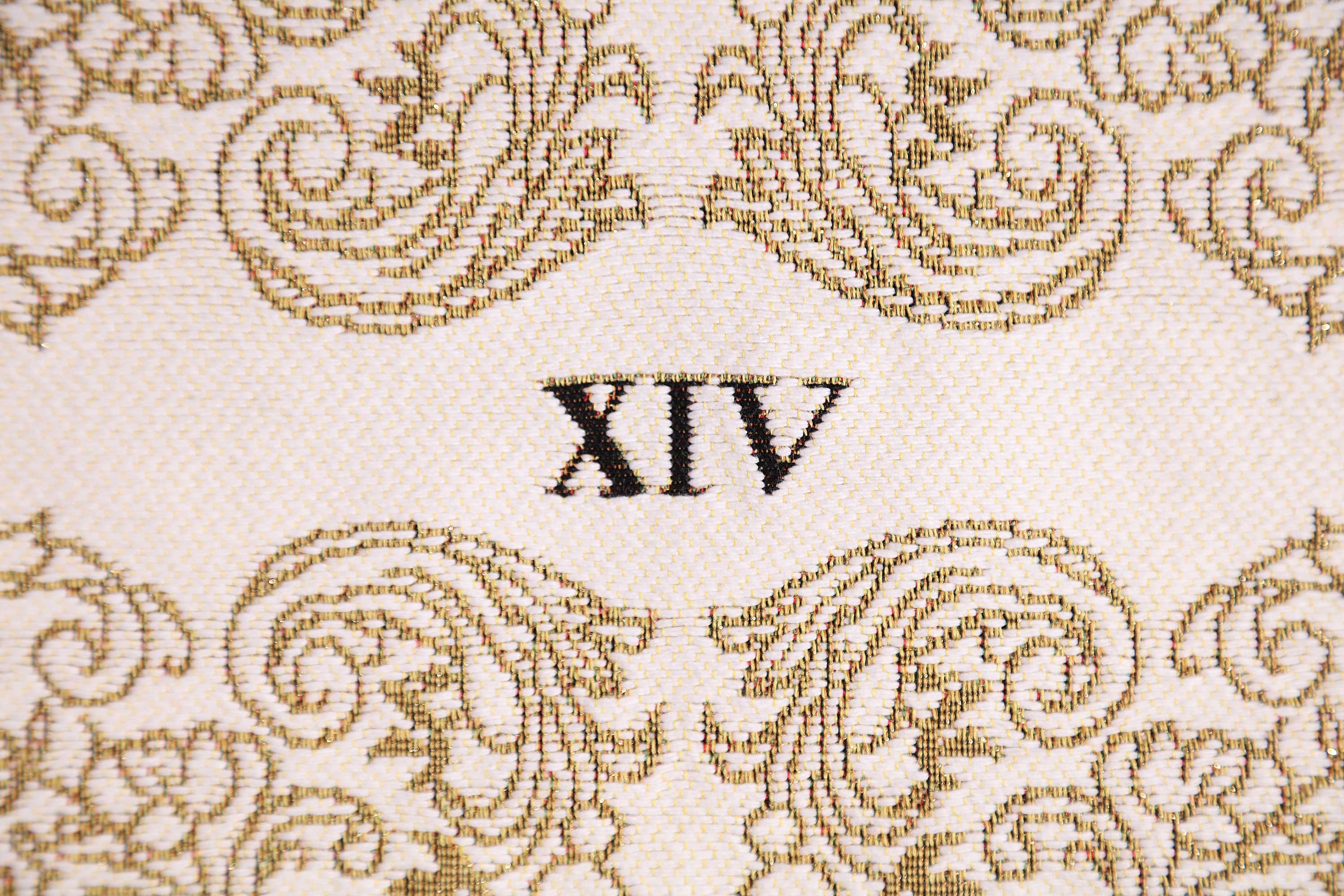 This exquisite cushion cover is a stunning example of jacquard weaving, meticulously crafted to bring an air of elegance to any room. The fabric, a luxurious cream with intricate metallic gold thread, catches the light beautifully, highlighting its detailed design. At the heart of the cushion cover is a central image featuring a scrolling decoration that frames a classic fleur-de-lys and the Roman numeral XIV, evoking a sense of regal heritage and timeless sophistication. At the bottom, the words "La Savonnerie Royal Versailles" are elegantly woven, accompanied by a crown, symbolizing royal luxury and high quality. This cushion cover, with its jacquard woven beauty and sophisticated design, adds a touch of aristocratic charm to any decor.