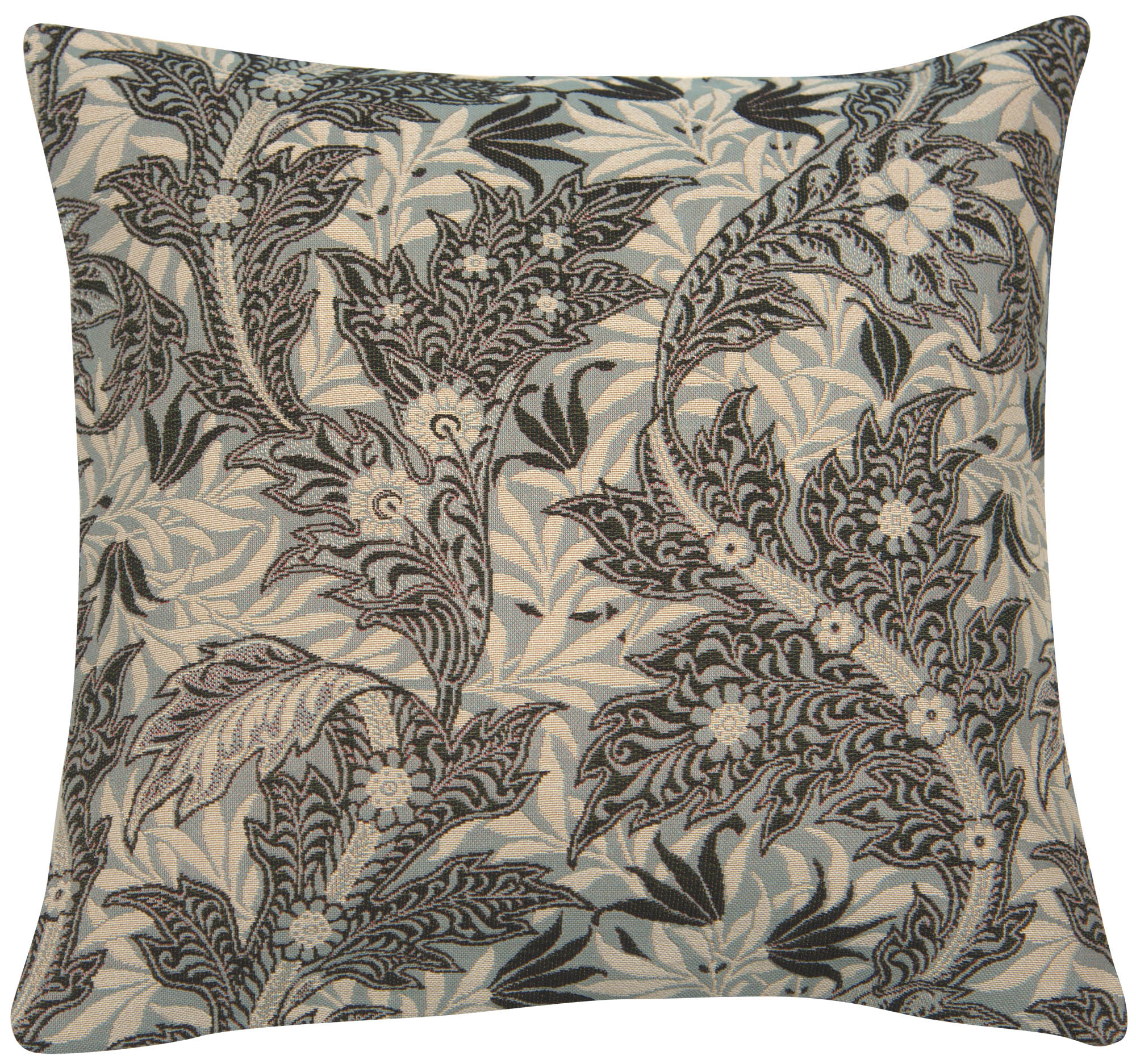 Add a touch of classic elegance to your décor with the Le Petit Paradis Bleu Cushion Cover. This decorative accent features timeless Anthacus leaves intertwined with other historical flora. The cool blue colors of the cushion cover are set against a frosty background of silvery grey. Perch the pillow on a velvet blue lounge chair or pair two with a sleek velvet blue sofa for a touch of contrast. Decorative tapestry pillows such as this provide lasting décor to any room. The cover is backed in a solid fabric with zipper closure. Woven in France.