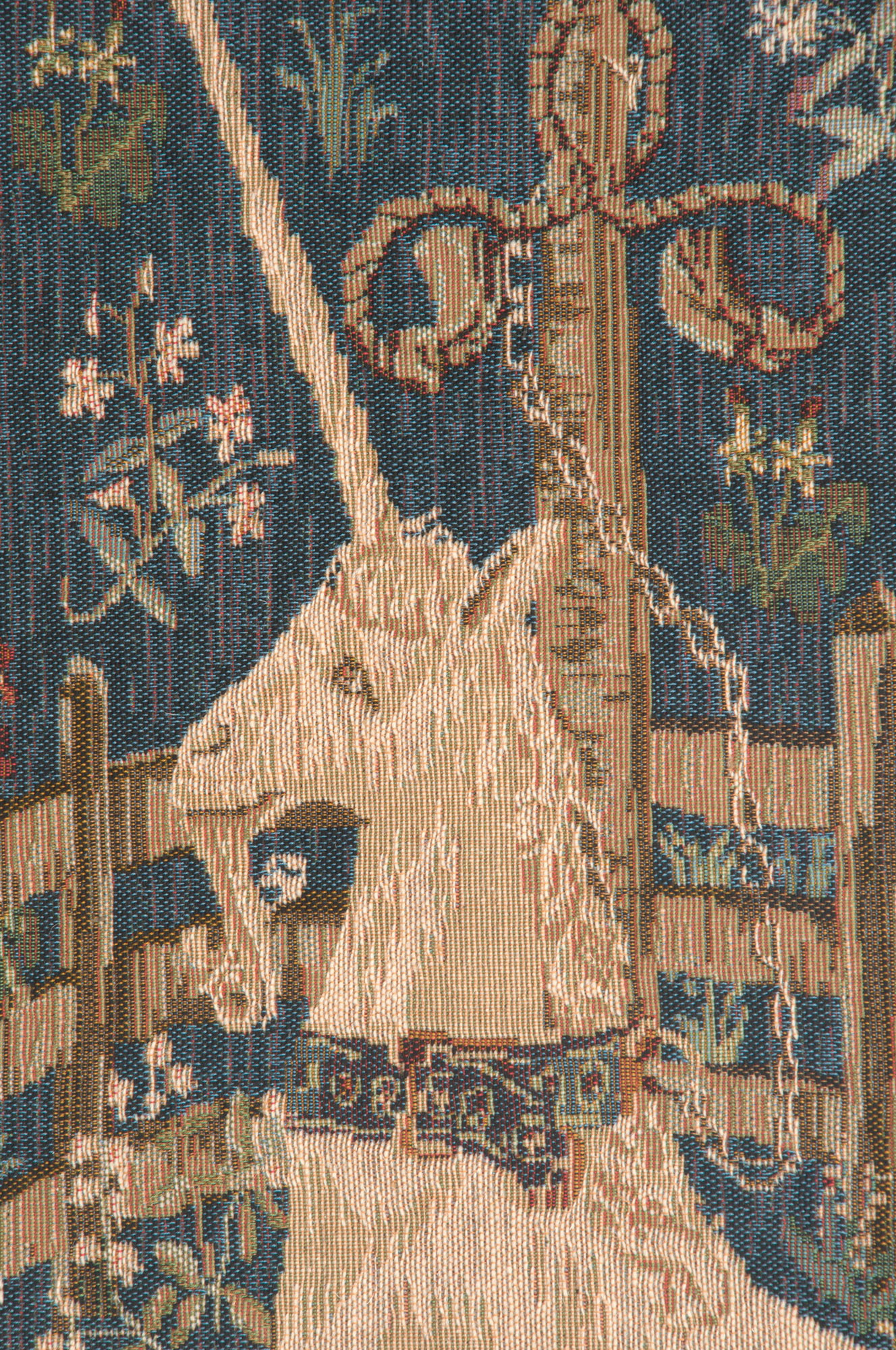 Licorne Captive III is a simpler rendition of the early 15th century original which is part of the set, Chasse a la Licorne, or The Hunt of the Unicorn. The unicorn is attached by a golden chain to a pomegranate tree. This jacquard wall tapestry is also known as Captive Unicorn.