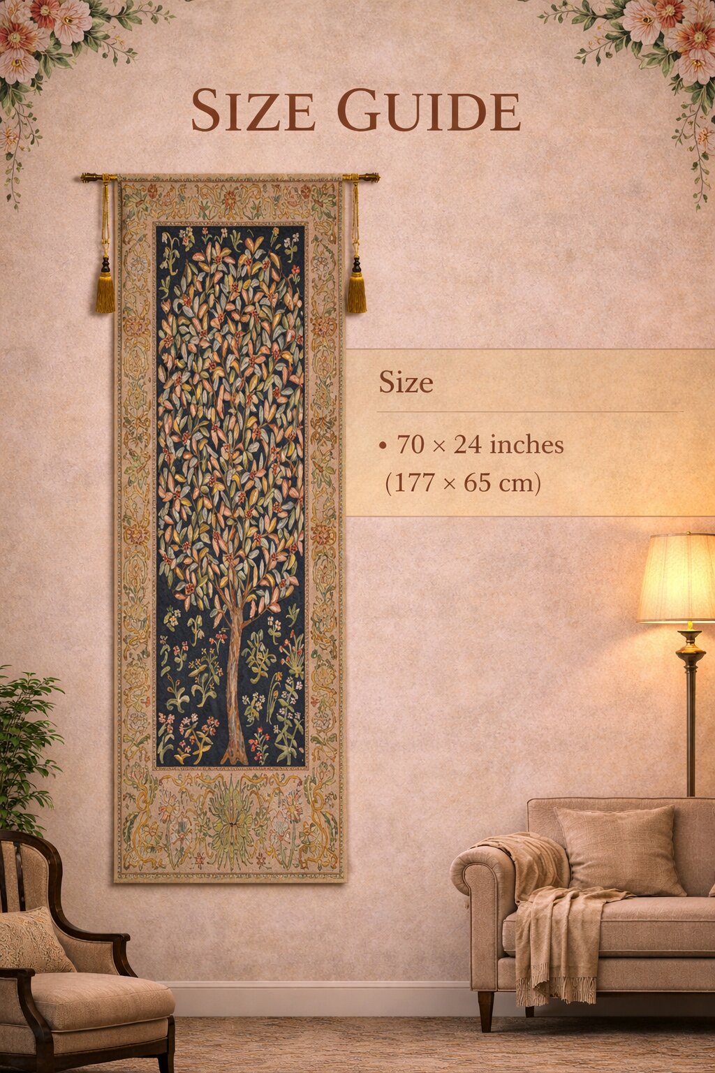 Woven beautiful soft pastels, our Pastel Tree of Life Portiere Tapestry bring mystical motifs to the home. This vertical hanging tapestry is based on the famous work of William Morris, the 19th century artist. The use of classic mille-flurs motifs surrounding the tree of life depiction harkens back to significant tapestry weaving techniques of centuries past. The tree of life signifies the concept of immortality and is often found in folklore and cultural works. Our tapestry is made in a myriad of beautiful soft hues and features a lined back and tunneling for easy hanging on your own rod. Woven in Belgium.